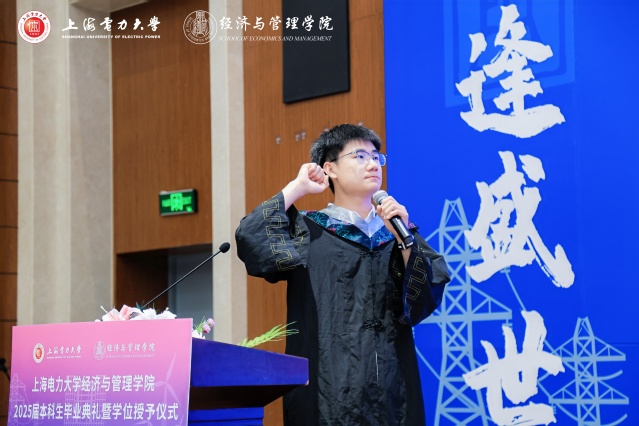 “铭记校训,爱国勤学,务实奋进,坚定理想信念,脚踏实地,砥砺前行,传承时代精神,不畏艰险,勇担使命,把个人理想追求融入党和国家事业之中,以青春之我、奋斗之我,为民族复兴铺路架桥,为祖国建设添砖加瓦。”铮铮誓言、字字铿锵!满怀激情的毕业献词呐喊出上电经管学子的心声与壮志。