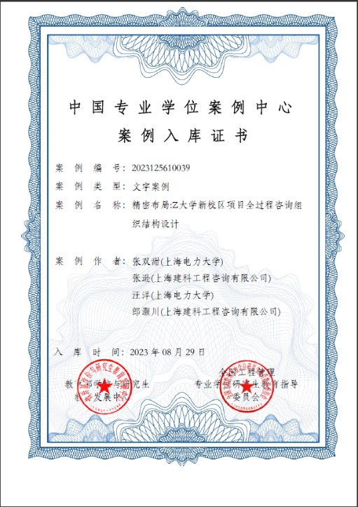 全国工程管理专业学位研究生教育指导委员会2022年9月14日发布《关于工程管理硕士(MEM)专业学位教学案例---第五批案例征集入库的通知》,公司积极组织教师参与。经评审公司工程管理专业张双甜、汪洋两位教师与上海建科工程咨询有限公司的张逊、郎灏川共同撰写的《精密布局:Z大学新校区项目全过程咨询组织结构设计》教学案例成功入选中国专业学位案例中心案例库。