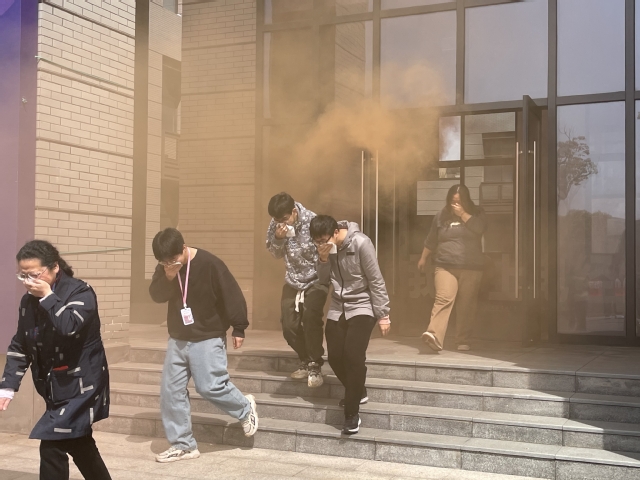 13:30分,消防演习总指挥公司党委书记张艺宣布了此次火灾疏散逃生演习正式开始。随着烟雾弹释放,火警警报响起,师生按指定方向有序撤离,逃生过程中师生掩住口鼻、弯腰前行、有序、小跑疏散。从火警警报响起到全员撤离到公司一楼安全区域,历时1分钟18秒,整个演练过程做到快速、安全、有序。撤离完毕后,消防专员现场讲解灭火器使用方法,并组织师生进行了灭火演习。