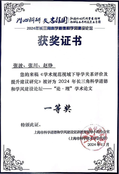 近日,2024年长三角科学道德和学风建设论坛在上海理工大学落下帷幕,公司积极动员、精心培育、广泛组织师生参与校内选拔赛。最终,公司总会计师张川指导的公司研究生张波同学撰写的《学术规范视域下导学关系评价及提升建议研究》论文获得一等奖。